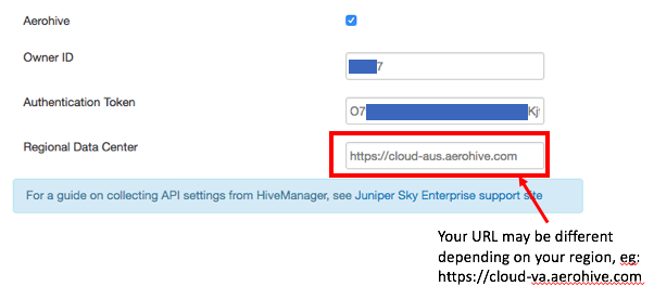 Access Tokengenerated in Step 2 into the Authentication Token field. - Copy the HiveManager URL from Step 3 into the Regional Data Center field.